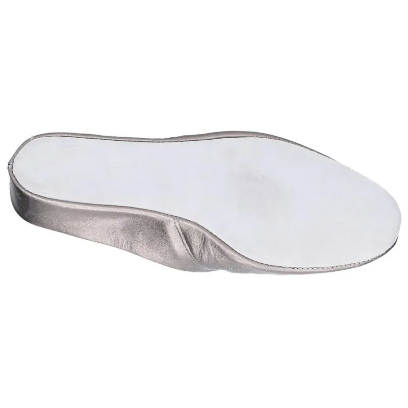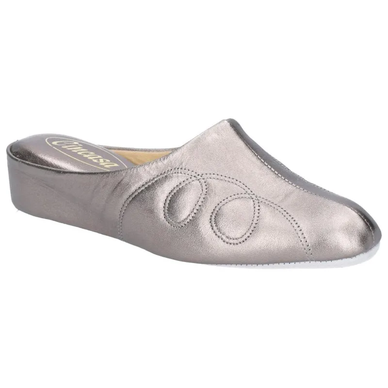 Traditional leather house shoes from Cincasa. This luxury womens mule slipper is crafted with a supple metallic leather upper with vintage designed leather soled base with subtle wedge.