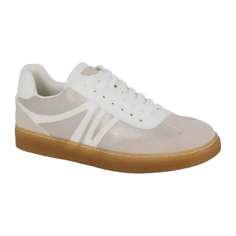 The ladies Reda Trainer is a must have from Cipriata. This fashion trainer is crafted in a soft and shimmering synthetic beige, white and gold design. Fastened with white laces and offers padded collar and tongue for a comfortable fit. Lined with a soft, padded insole.