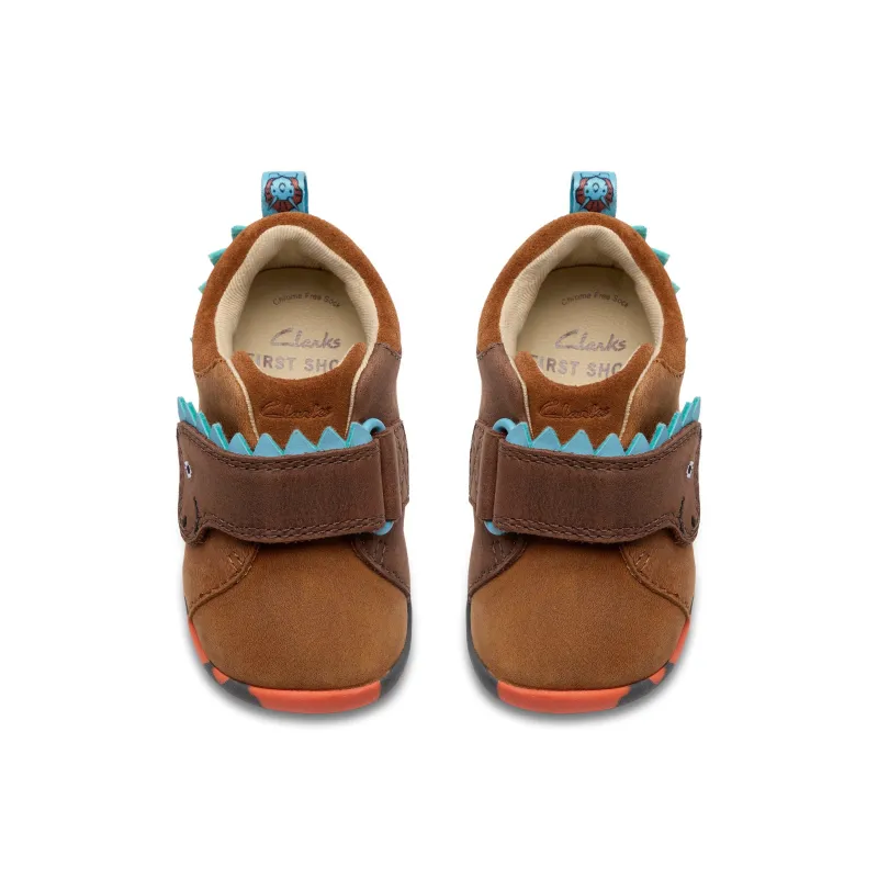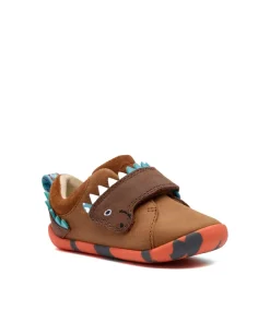 Clarks Roamer Stomp T is a playful pre-walker designed to make every early adventure fun. Made from soft leather, it features a charming dinosaur-inspired design with little spikes and friendly character details. Its flexible lightweight sole helps support natural movement and the velcro strap keeps the fit secure and simple.