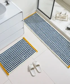 This runner is exceptionally versatile and perfect as a cozy bedside mat in a primary, kid’s, or guest bedroom, instantly eliminating cold-floor shock. Its durable non-slip construction also makes it ideal for busy areas like entryways and aisles, ensuring both safety and style. The crisp blue and cream stripes, accented by a bold pop of mustard yellow on the ends, inject effortless color and high-touch texture, making the Cloud Stripe Comfort Mat a vibrant, welcoming piece of functional home decor.