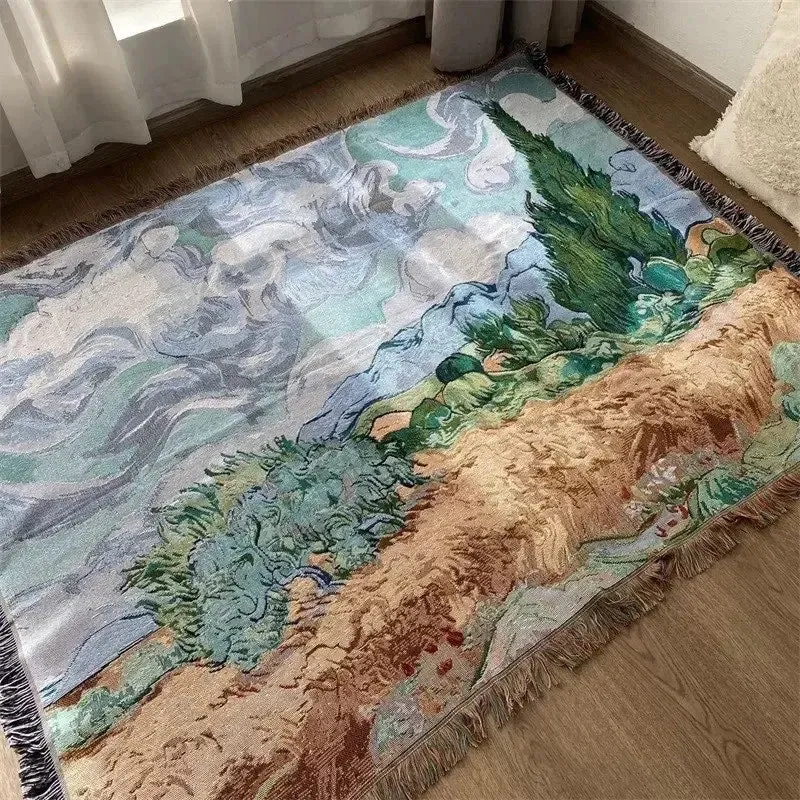 Wrap yourself in the beauty of a masterpiece with the Cypress Breeze Artisanal Woven Throw, inspired by Van Gogh’s iconic Wheat Field with Cypresses. This exquisite woven blanket captures the swirling skies, golden fields, and lush greenery of the original painting, bringing a touch of artistic elegance to your space. Crafted with a premium cotton blend, it offers a soft yet durable texture, perfect for cozying up on chilly nights or enhancing your décor as a striking wall tapestry.