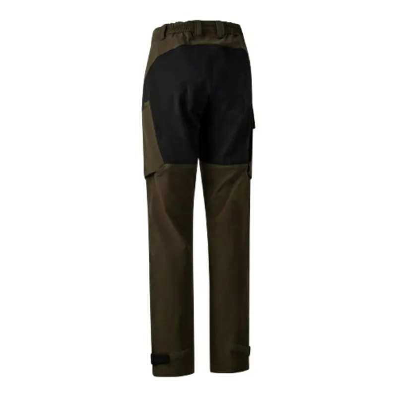 4-way stretchable cotton fabric. Waist with elastic at the back. Two front pockets. Thigh pocket with a pocket flap. Thigh pocket with a zipper. Hidden knife pocket at the right hand thigh pocket. Pre-shaped knees. Adjustable at the ankles with velcro straps.