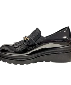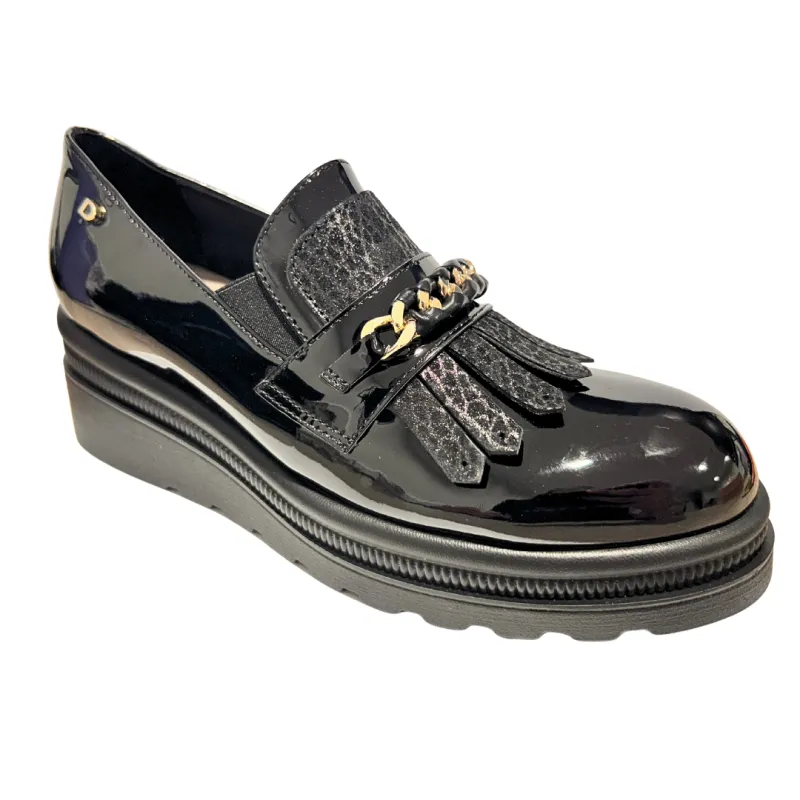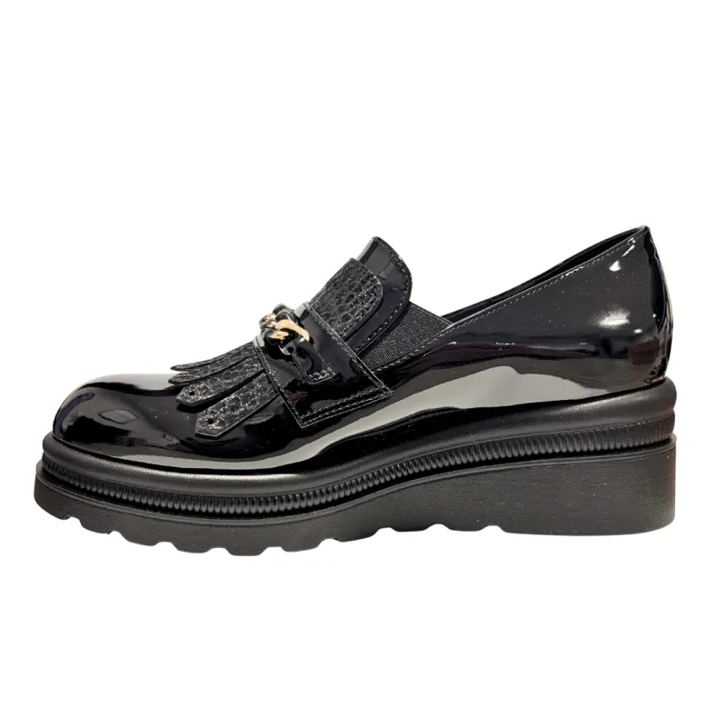 Step into elevated style with the Donna Serena Marea Vernice Nero. This women’s loafer combines sleek patent leather with a textured vamp and striking fringe detail, finished with a bold gold-tone chain for a hint of luxe glamour. The lightweight wedge sole offers subtle lift and all-day comfort, making it as practical as it is chic.