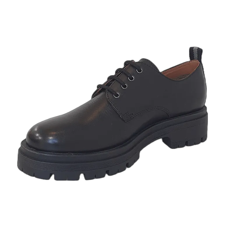 Rock the chunky vibe with these ladies shoes from Dubarry in smooth black leather featuring lace up fastening for a secure fitting. Kanna would be suitable for school shoe use or work. Lined in a mix of smooth leather and textile with a comfortable leather footbed. The chunky cleated sole unit has a height of 40mm giving you that extra edge.
