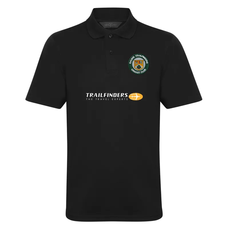 Official Ealing Trailfinders Cricket Club senior polo in black with club logo embroidered on left breast.