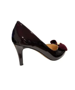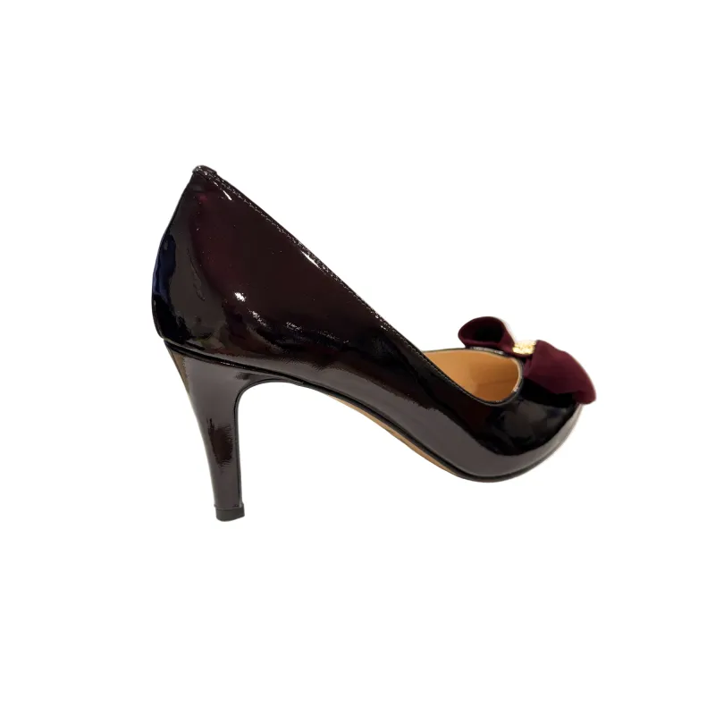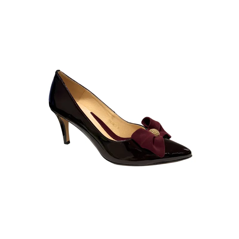 Step out in timeless elegance with the Ladies Emis Pointed Toe Court Shoe in Burgundy. Crafted from glossy patent leather, this sophisticated heel features a sleek pointed toe and a plush velvet bow adorned with a gold accent for a touch of luxury. The mid-height heel offers a graceful lift without compromising on comfort, perfect for weddings, evenings out or elevating your workwear look.