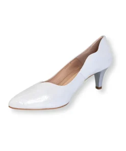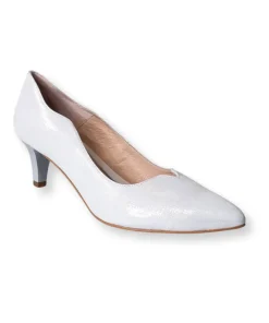 Stunning handmade court shoes in a timeless style from Emis, perfect for that important event you have coming up. These court shoes are in a pointed toe style crafted from sparkling light silver leather with a laser cut design around the top line with a low cut front. Finished in a 60mm kitten heel and lined in soft leather with a comfortable cushioned leather footbed.