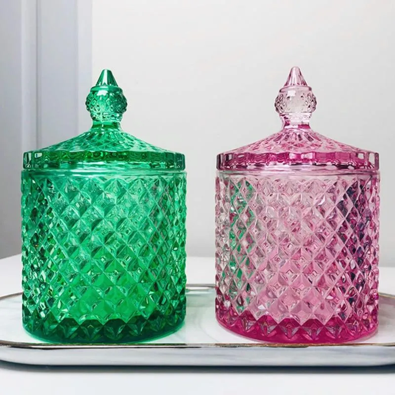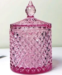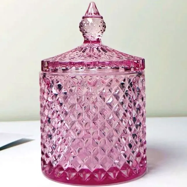 The Empress Colored Glass Jars with Lid features a stunning diamond embossed pattern, taking on a retro chic aesthetic that lends style to any table. With multiple storage purposes and available in various colors, keep your goodies or supplies organized in style.