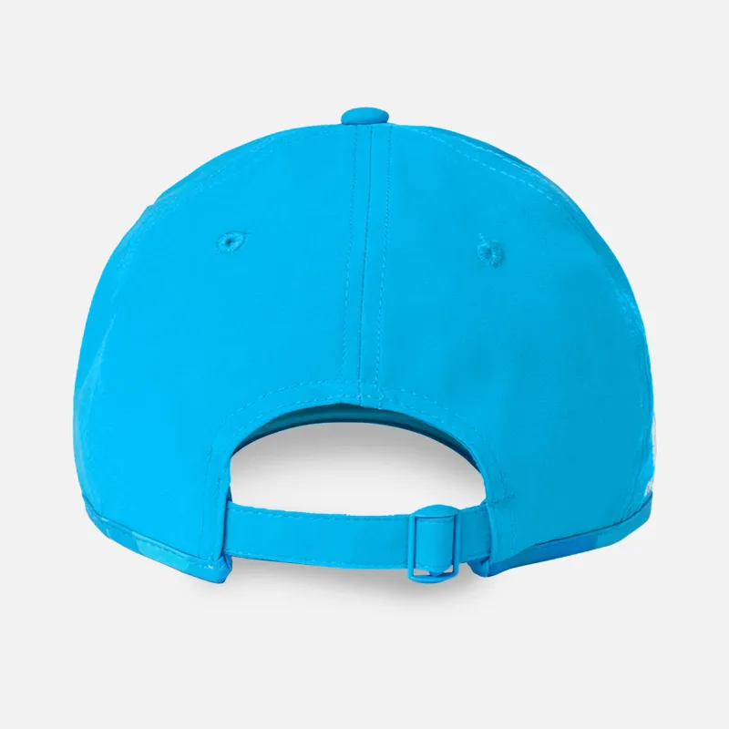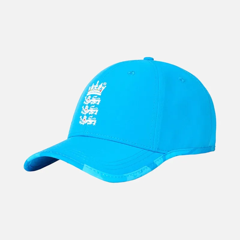 ECB England Cricket Cap in bright blue ‘Cloisonne’, Castore, adjustable strap for a comfortable performance fit. Curved visor hat featuring the England crest embroidery, as featured in the One Day International series across 2024-25. One size hat, Official Castore ECB England collection, licensed merchandise.