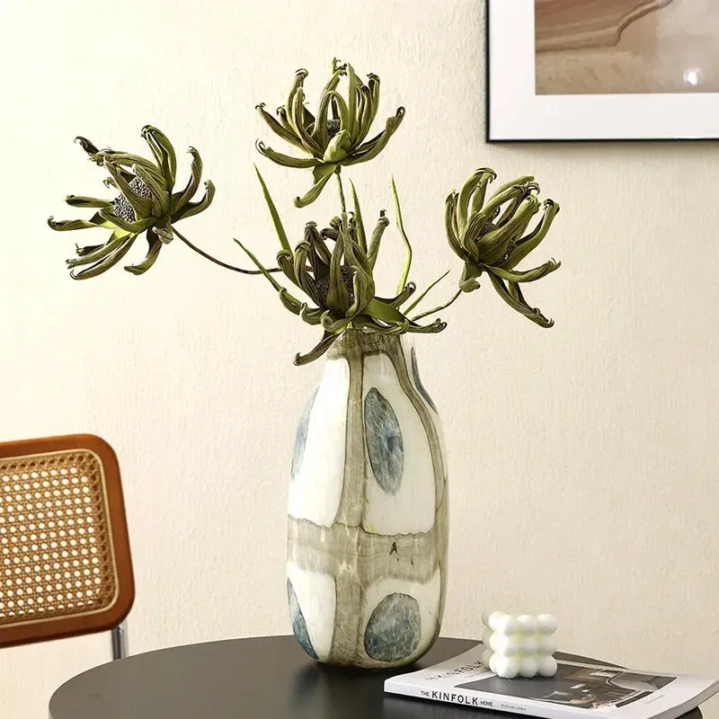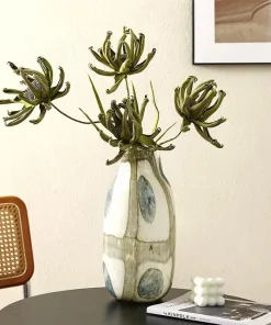 Bring nature’s artistry into your home with the Forest Pebble Glass Flower Vase. This distinctive design blends organic textures and modern glass artistry, featuring soft cream tones adorned with pebble-like markings in serene forest green and deep blue. Each vase is mouth-blown, giving it a unique silhouette and subtle variations in pattern—no two pieces are exactly alike. The smooth, tactile finish captures the beauty of handcraft while offering a contemporary edge that works effortlessly with any decor style. Perfect for holding a single statement stem, a lush floral arrangement, or even standing alone as a decorative centerpiece, this vase adds a refreshing touch of organic elegance to your living room, dining table, or bedroom.