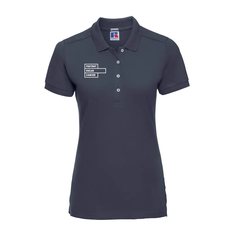 Foxtrot Oscar Cancer Ladies Navy Blue Stretch Polo Shirt.