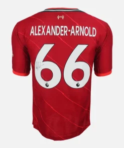 Alexander-Arnold personally signed and framed Liverpool football shirt, authentic pro vapor player version home kit from the 2021-22 season. A pivotal force in Liverpool’s 2021-22 cup double, he lifted the FA Cup and League Cup and posted 12 Premier League assists from right-back to fuel the team’s attack. Official Shirt, Playmaker Signature, displayed in our smart compact shirt frame finished in black aluminium.