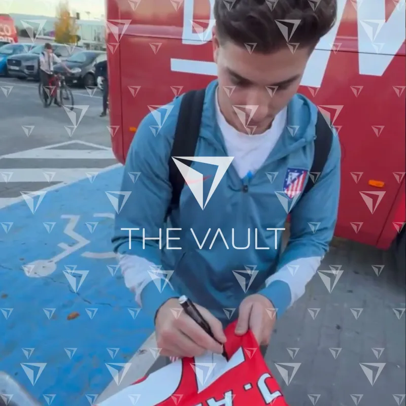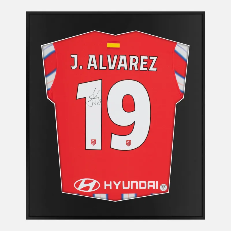 Julian Alvarez personally signed and framed Atletico Madrid football shirt. From the 2024-25 season, following his €95 million club record transfer from Manchester City. Home kit, displayed in our smart compact shirt frame finished in black aluminium.