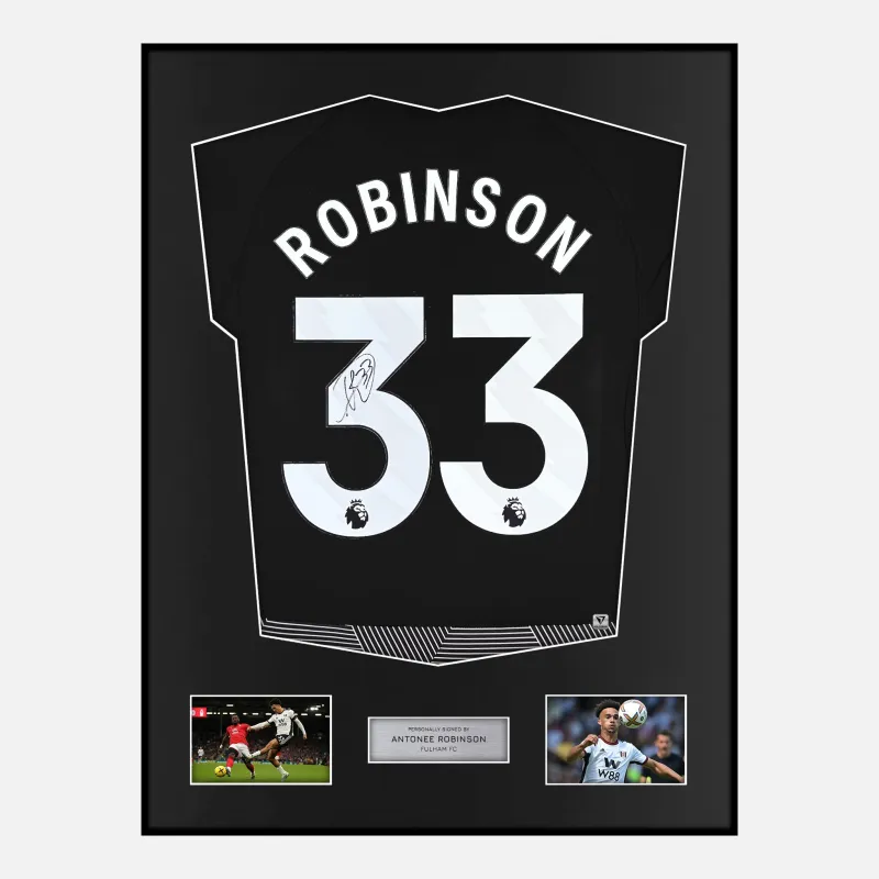 Antonee Robinson personally signed and framed Fulham football shirt, from the 2023-24 Premier League season. Displayed in our ultra-slim aluminium shirt frame finished in satin black.