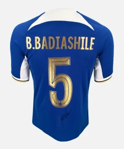 Benoît Badiashile personally signed and framed Chelsea football shirt. 2023-24 season with gold cup edition name and number print, displayed in our smart compact shirt frame finished in black aluminium.