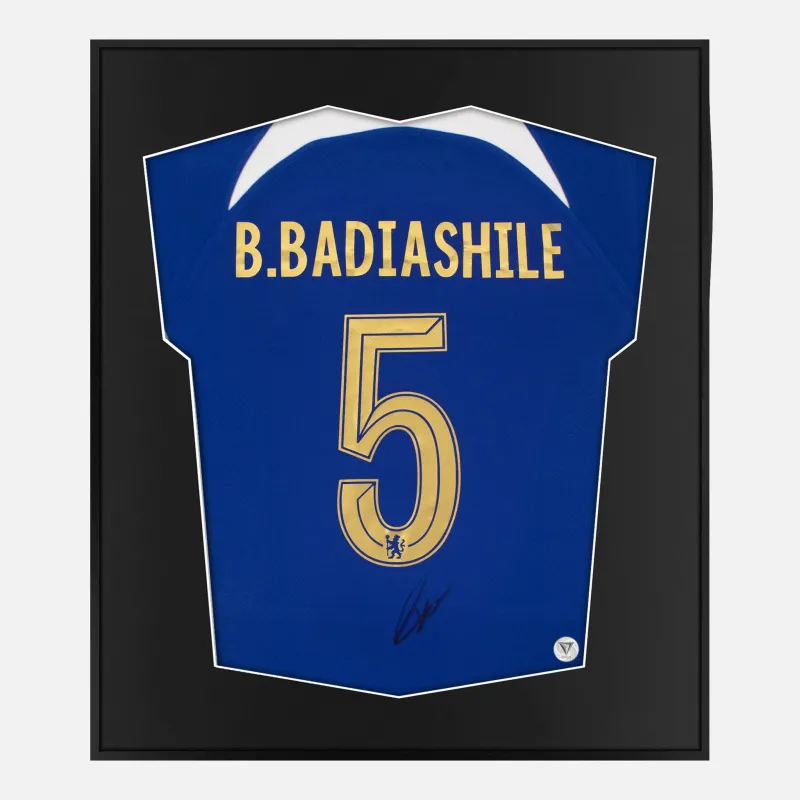 Benoît Badiashile personally signed and framed Chelsea football shirt. 2023-24 season with gold cup edition name and number print, displayed in our smart compact shirt frame finished in black aluminium.