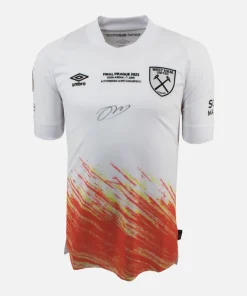 Jarrod Bowen personally signed and framed away West Ham United football shirt. As worn in the Conference League Final with match detail. Original shirt, sponsor less with embroidery. The hammers secured a historic European Cup scoring a last minute winner vs Fiorentina. Displayed in our smart compact shirt frame finished in black aluminium.
