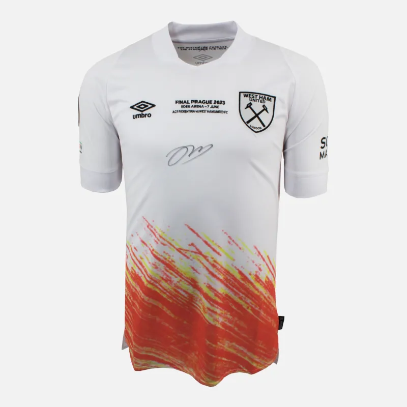 Jarrod Bowen personally signed and framed away West Ham United football shirt. As worn in the Conference League Final with match detail. Original shirt, sponsor less with embroidery. The hammers secured a historic European Cup scoring a last minute winner vs Fiorentina. Displayed in our smart compact shirt frame finished in black aluminium.