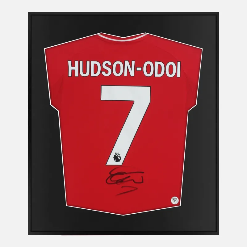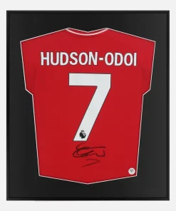 Callum Hudson-Odoi personally signed and framed Nottingham Forest football shirt, Official Adidas home kit from the 2025-26 season. Forest’s number 7 has produced club-defining moments, including the winner at Anfield for the first league win there since 1969 and the decisive strike in the 1-0 victory over Manchester City on 8 March 2025. Official Shirt, Star Signature, displayed in our smart compact shirt frame finished in black aluminium.