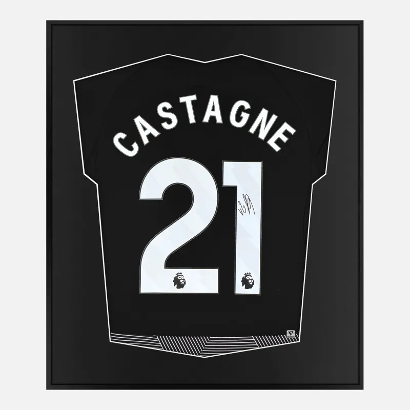 Timothy Castagne personally signed and framed Fulham football shirt, from the 2023-24 Premier League season. Displayed in our smart compact shirt frame finished in black aluminium.