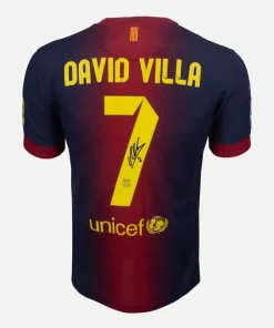 David Villa personally signed and framed Barcelona football shirt, Official home kit from the 2012-13 season. La Liga glory was secured with a 100-point season, while Villa’s catalogue of honours with Barça includes the 2011 Champions League, the Copa del Rey and multiple domestic titles. Renowned for ice-cold movement in the box and big-game end product, he gave decisive contributions across his spell in blaugrana. Official Shirt, Icon Signature, displayed in our ultra-slim aluminium shirt frame finished in satin black.