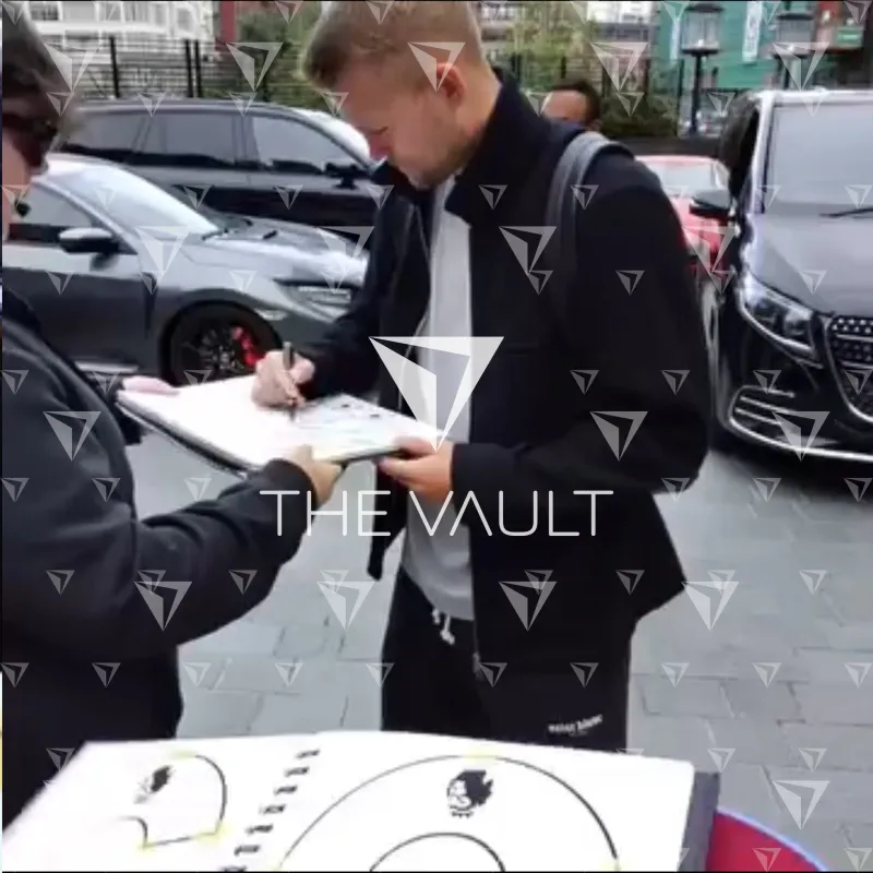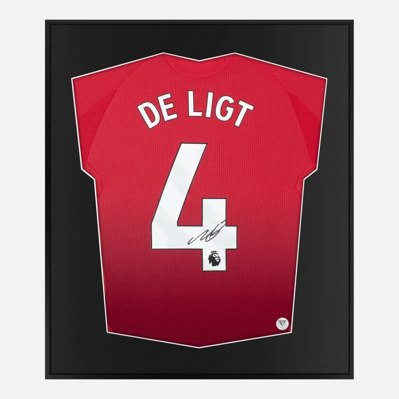 Matthijs De Ligt personally signed and framed Manchester United home shirt from the 2024-25 Premier League season. Displayed in our smart compact shirt frame finished in black aluminium.