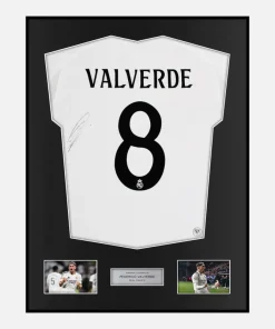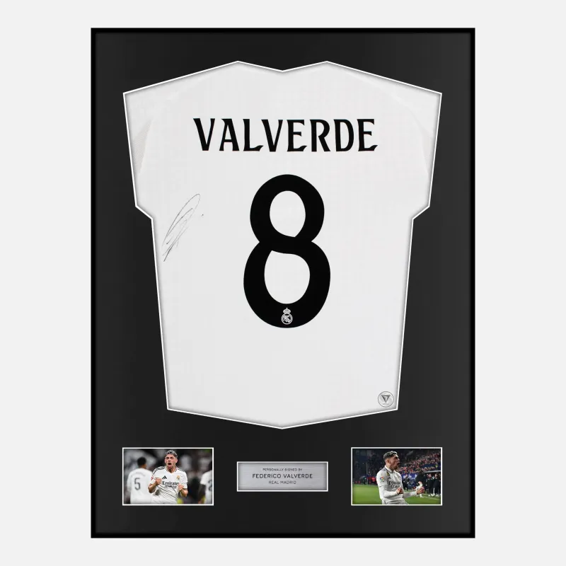 Federico Valverde personally signed and framed Real Madrid football shirt, 2024-25 home kit. Displayed in our ultra-slim aluminium shirt frame finished in satin black.