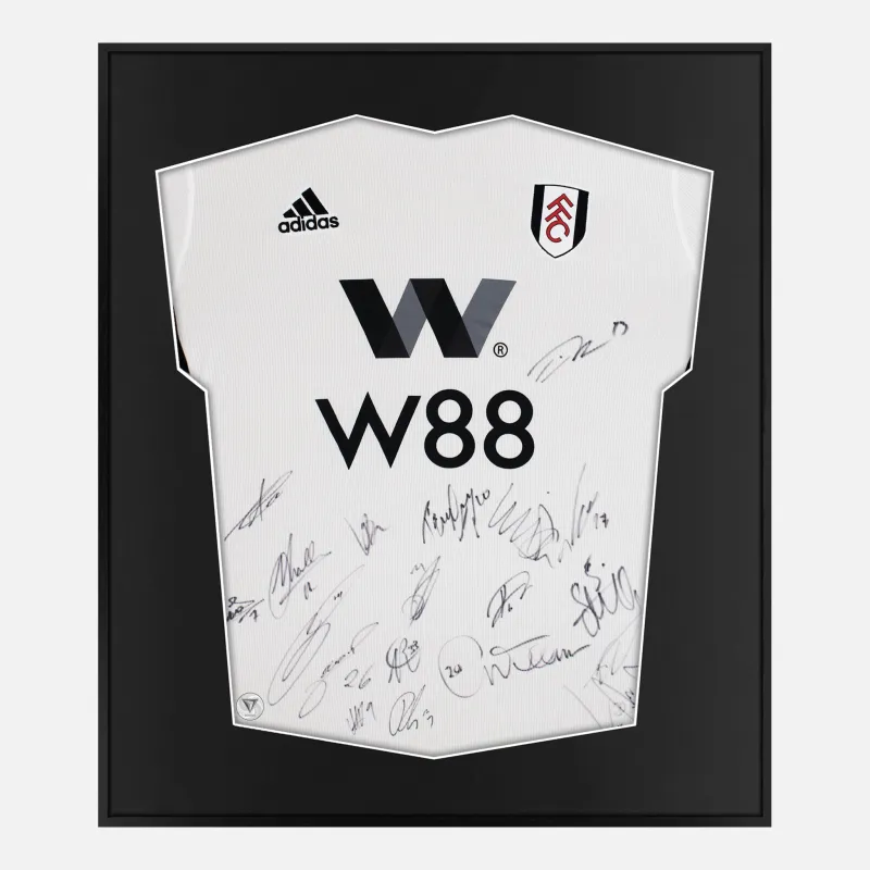 Personally squad signed and framed Fulham football shirt, official Adidas home from the 2022-23 Premier League season. This squad-signed piece celebrates Fulham’s 10th-place Premier League finish on 52 points and a confident FA Cup run to the quarter-finals in 2022-23. Official Shirt, Authentic Signature, displayed in our smart compact shirt frame finished in black aluminium. Includes autographs from Willian, Tom Cairney, Issa Diop, Tosin Adarabioyo, Antonee Robinson, João Palhinha, Neeskens Kebano, Manners Solomon, Mitrovic and more. Kitman stock direct from Fulham.