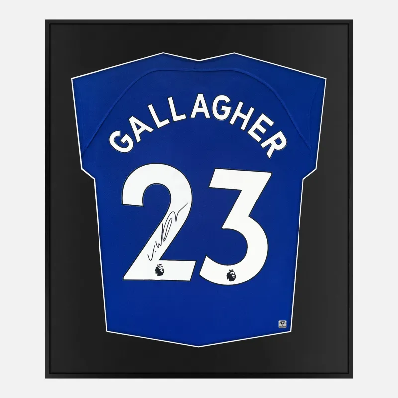 Conor Gallagher personally signed and framed Chelsea football shirt. From the 2022-23 Premier League season, displayed in our smart compact shirt frame finished in black aluminium.