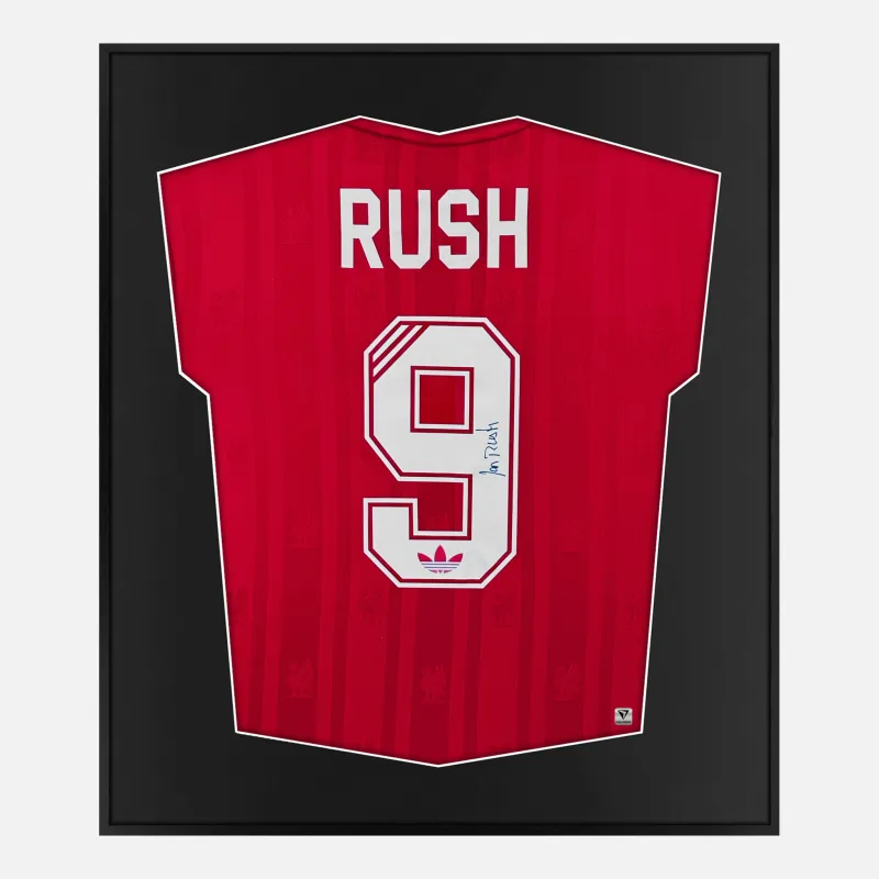 Ian Rush personally signed and framed Liverpool football shirt. The reds all time top goal scorer with 346 goals and 2 time European cup winner. Displayed in our smart compact shirt frame finished in black aluminium.