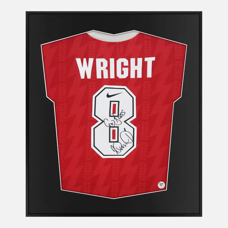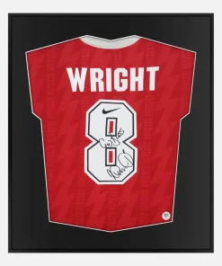 Ian Wright personally signed and framed Arsenal football shirt, dedicated authentic signature, rare and original 1994-96 official Nike home kit. Arsenal’s record goalscorer with 185 goals, Wright won the 1991-92 First Division Golden Boot and powered the club to major honours including the 1993 FA Cup and League Cup double and the 1994 European Cup Winners’ Cup. Original Shirt, Legend Signature, displayed in our smart compact shirt frame finished in black aluminium.