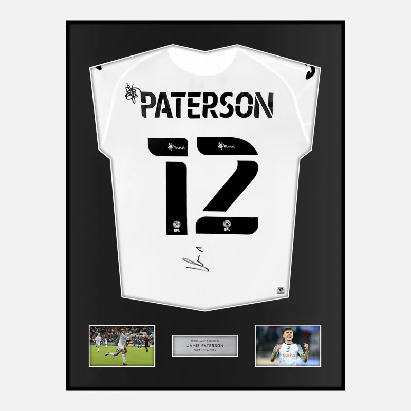 Jamie Paterson personally signed and framed Swansea football shirt, from the 2022-23 Championship season. Displayed in our ultra-slim aluminium shirt frame finished in satin black.