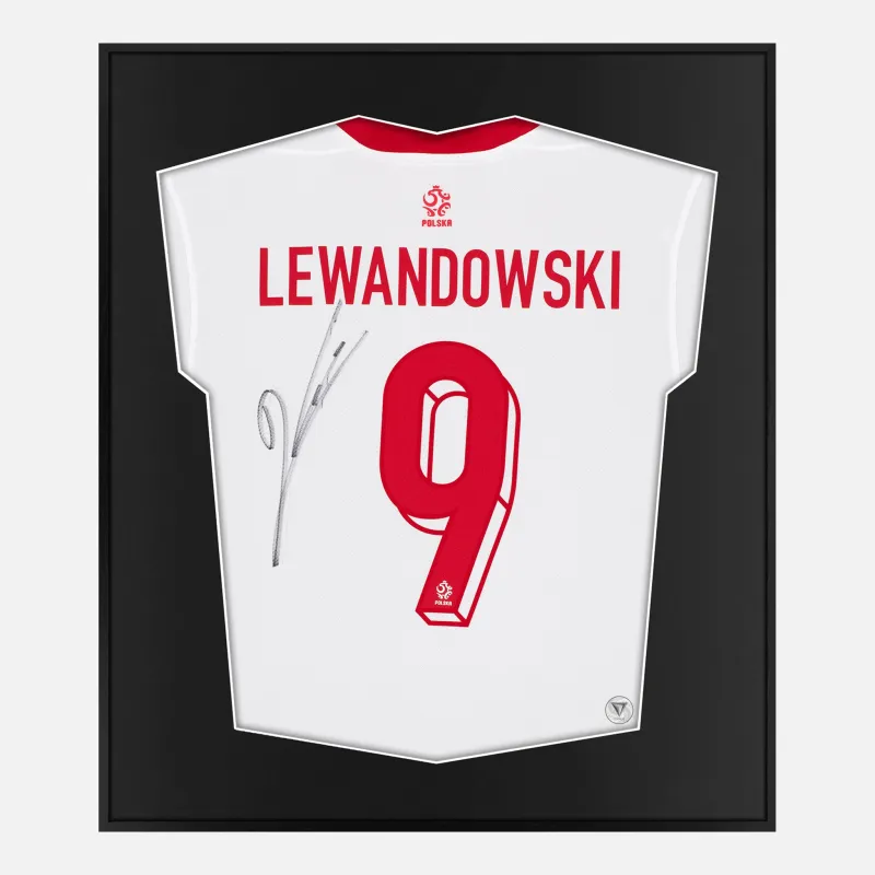 Robert Lewandowski personally signed and framed Poland football shirt, from 2024-25. Iconic signature from one of the greatest strikers of al time, displayed in our smart compact shirt frame finished in black aluminium.
