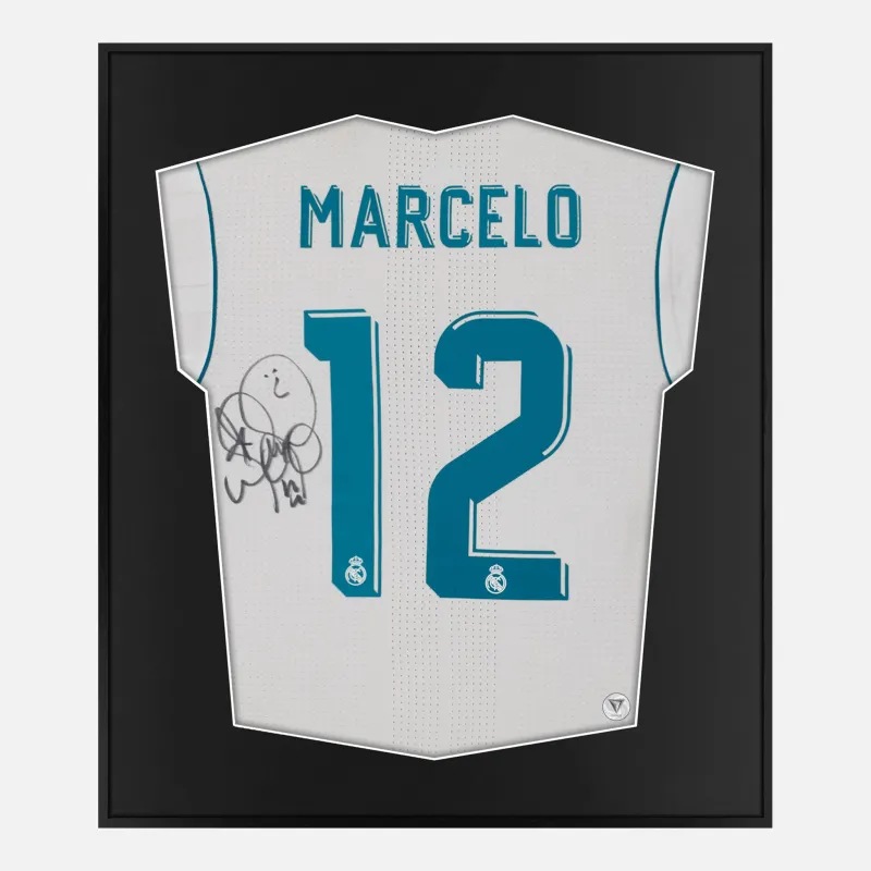 Marcelo personally signed and framed Real Madrid football shirt, iconic white home shirt from the 2017–18 Champions League winning season. He started in the Champions League final victory over Liverpool, securing his fourth European crown. Marcelo won 25 major honours with Real Madrid, more than any other player in club history, across 15 remarkable seasons. Rare authentic shirt, elite signature, displayed in our smart compact shirt frame finished in black aluminium.