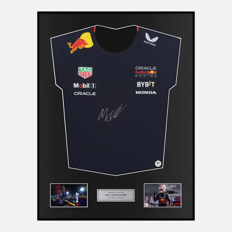 Max Verstappen personally signed and framed Red Bull Racing T-shirt, Official Castore F1 Team setup shirt from the 2025 season. Record holder for 19 wins in a single season and a multiple-time world champion, he has turned Red Bull’s colours into a symbol of sustained supremacy at the top of Formula 1. Official Shirt, GOAT Signature, displayed in our ultra-slim aluminium shirt frame finished in satin black.