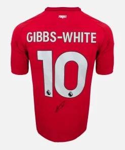 Morgan Gibbs-White personally signed and framed Nottingham Forest football shirt, Official Adidas home shirt from the 2024-25 season. A year that delivered European qualification and an FA Cup semi-final saw him contribute seven league goals while leading the attack from midfield. Official Shirt, Playmaker Signature, displayed in our ultra-slim aluminium shirt frame finished in satin black.