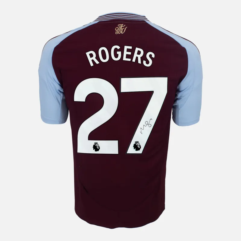 Morgan Rogers personally signed and framed and framed Aston Villa football shirt, Official Adidas 2023-24 Home kit. The versatile attacker delivered key contributions in the second half of the 2023-24 season, helping Villa maintain their top-four push under Unai Emery. Official Shirt, Rising Star Signature, displayed in our ultra-slim aluminium shirt frame finished in satin black.