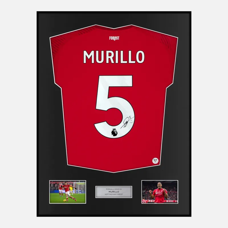 Murillo personally signed and framed Nottingham Forest football shirt from the incredible 2024-25 Premier League season. Original Adidas kit from historic season that saw Forest push for Champions League football. Displayed in our ultra-slim aluminium shirt frame finished in satin black.