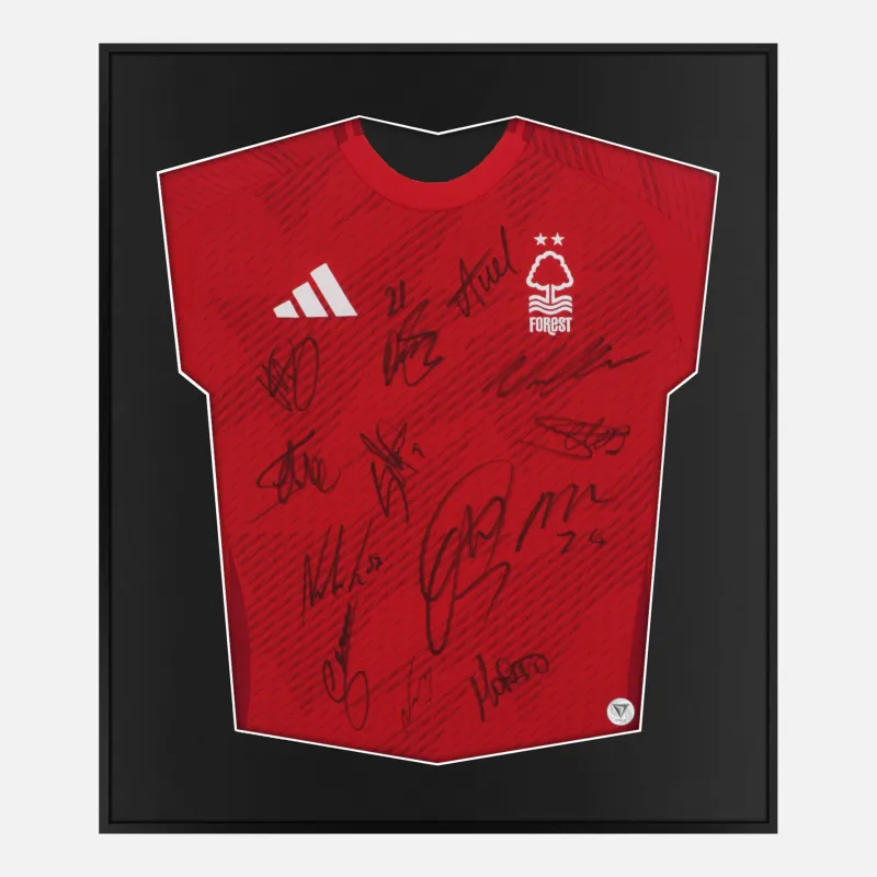 Personally squad signed and framed Nottingham Forest football shirt, from the incredible 2024-25 Premier League season. The team sealed seventh in the league to qualify for Europe for the first time since the mid-1990s and reached the FA Cup semi-final at Wembley, a breakthrough year that reignited Forest’s stature. Official Sponsorless Shirt, Historic Squad Signatures, displayed in our smart compact shirt frame finished in black aluminium. Includes autographs from Yates, Anderson, Hudson-Odi, Awoniyi, Milenkovic, Morato, Savona and Williams.