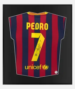 Pedro personally signed and framed Barcelona football shirt, original kit from the 2013-14 season. Displayed in our smart compact shirt frame finished in black aluminium.