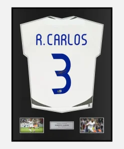Roberto Carlos personally signed and framed Real Madrid football shirt, from the 2006-08 La Liga back-to-back winning seasons. Displayed in our ultra-slim aluminium shirt frame finished in satin black. Beckett certified.