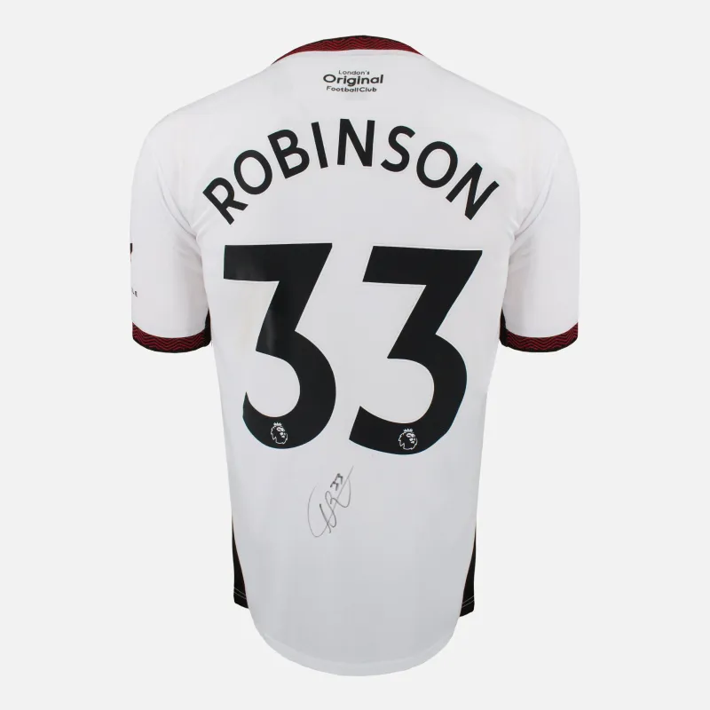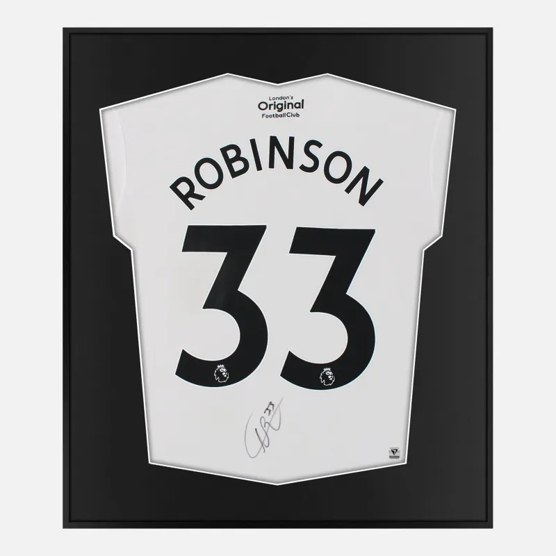 Antonee Robinson personally signed and framed Fulham football shirt, from the 2022-23 Premier League season. Displayed in our smart compact shirt frame finished in black aluminium.