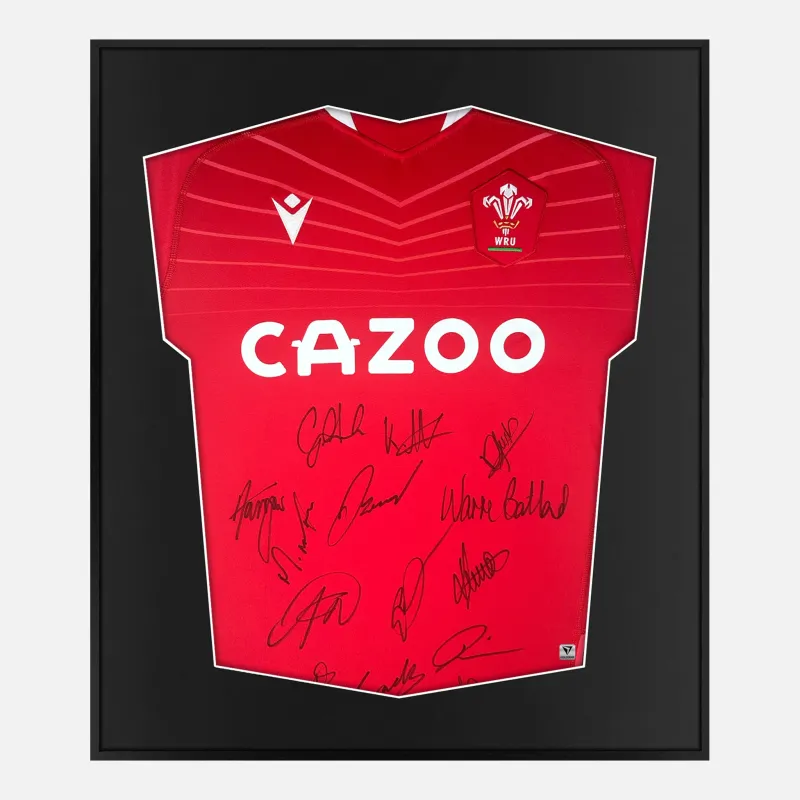 Personally squad signed and framed Wales rugby shirt, 14 autographs from the 2021-22 team. Displayed in our smart compact shirt frame finished in black aluminium.