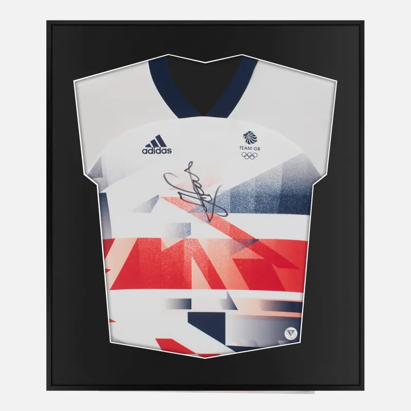 Sir Mo Farah personally signed and framed Team GB shirt. A four-time Olympic gold medallist and six-time World Champion, Farah achieved the extraordinary feat of winning both the 5,000m and 10,000m at two consecutive Olympic Games. He remains one of the most decorated long-distance runners of all time. Olympic dominance, legendary signature, displayed in our smart compact shirt frame finished in black aluminium.