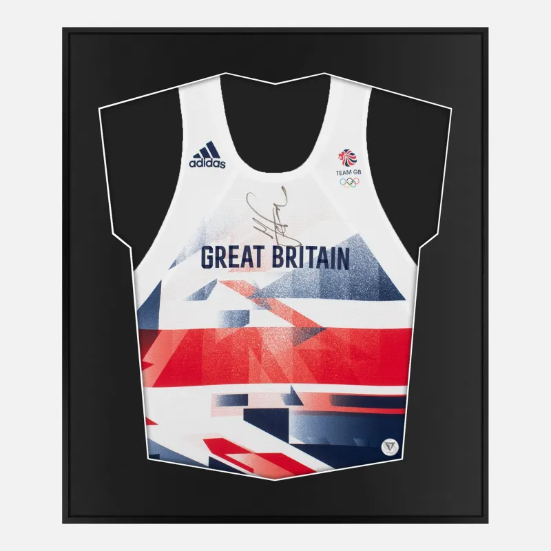 Sir Mo Farah personally signed and framed Olympic Team GB vest, gold autograph. A true Olympic legend, Farah captured gold in both the 5,000m and 10,000m at two consecutive Games, showcasing dominance rarely seen on the world stage. His career total of 10 global titles places him among the all-time greats. Olympic greatness, signed in gold, displayed in our smart compact shirt frame finished in black aluminium.