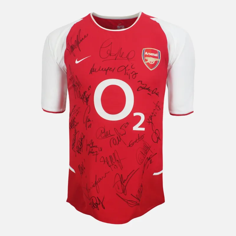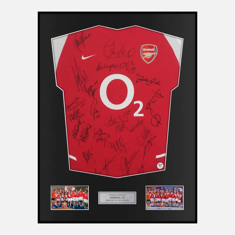 Personally squad signed and framed Arsenal football shirt, Official 2003-04 Nike Home kit signed by historic Invincibles team. The ultimate Arsenal artefact, celebrating the 2003-04 champions who went unbeaten across 38 league matches and completed the legendary 49-game unbeaten run, with Thierry Henry firing 30 Premier League goals and Patrick Vieira leading the side to the gold trophy. Champion Shirt, Legendary Signatures, displayed in our ultra-slim aluminium shirt frame finished in satin black.