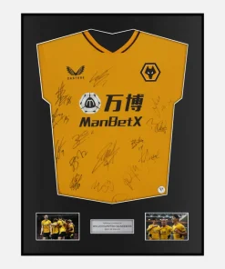 Personally squad signed and framed Wolverhampton Wanderers football shirt, official Castore home kit from the 2021-22 season. Wolves secured a top half finish with a strong squad featuring stars such as Neves, Moutinho, Raul, Neto and Hwang. Official Shirt, Squad Signatures, displayed in our ultra-slim aluminium shirt frame finished in satin black.