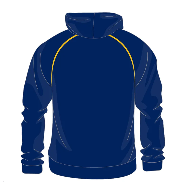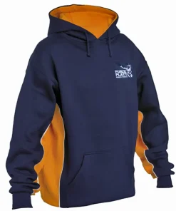 65% Polyester, 35% Cotton – with double hood and pouch pocket – Navy and amber with school crest.