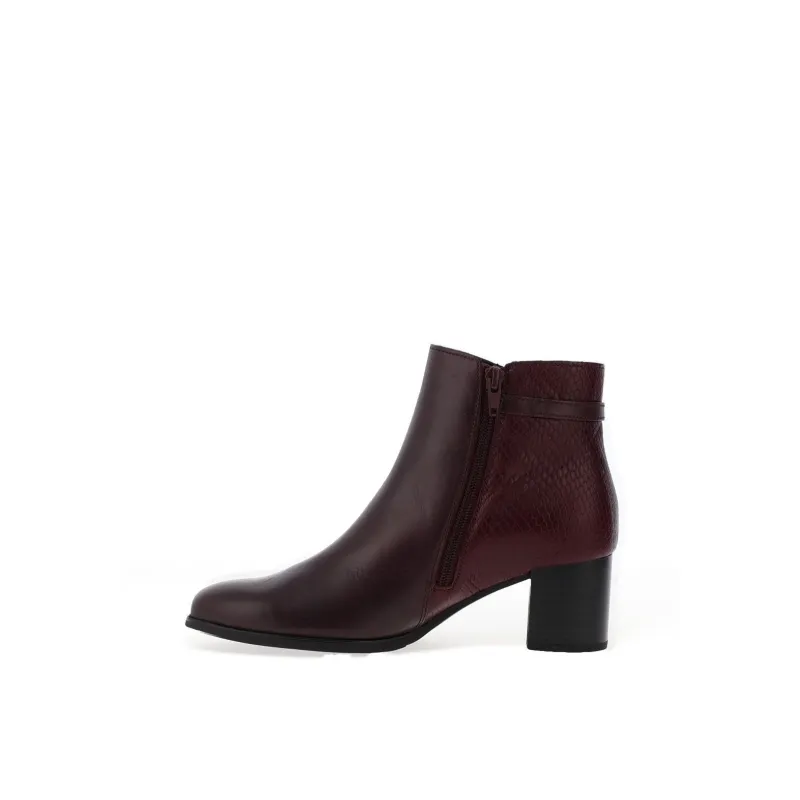Elevate your seasonal style with the Gabor 75.692 ankle boot in rich burgundy. This sophisticated silhouette combines smooth leather with a subtly embossed snake-print panel at the heel for added depth and flair. A decorative side tassel adds a feminine touch, while the mid-height block heel ensures stable, wearable height from day to night.
