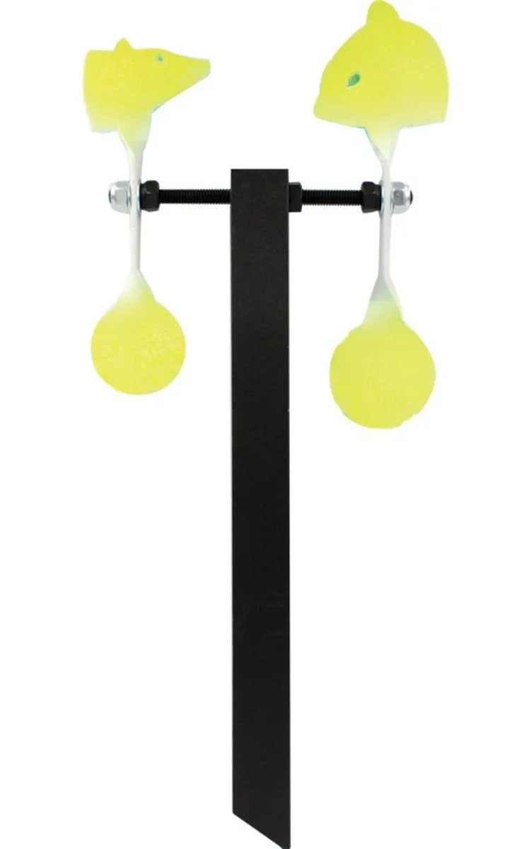 Rat and squirrel head top discs and plain bottom discs. 50mm and 45mm diameter targets. Includes 300mm steel spike. Perfect for vermin humane shot placement target practice.
